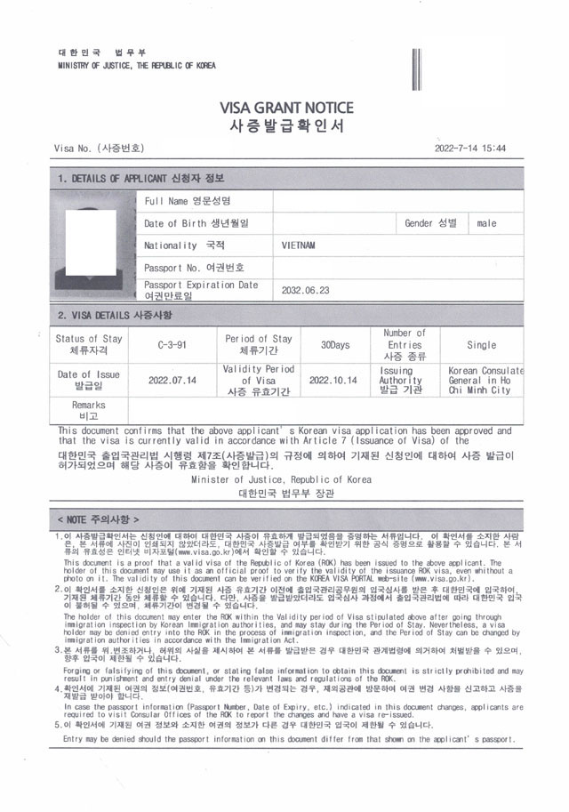 Kết quả: Khách hàng nhận được một visa điện tử Hàn Quốc (Visa Grant Notice) như trên được in trên giấy A4, được dùng làm thủ tục nhập cảnh tại cửa khẩu Sân bay Hàn Quốc.